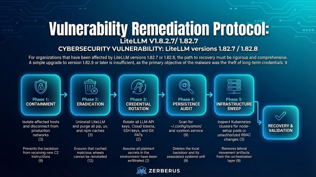 For organizations that have been affected by LiteLLM versions 1.82.7 or 1.82.8, the path to recovery must be rigorous and comprehensive. A simple upgrade to version 1.82.9 or later is insufficient, as the primary objective of the malware was the theft of long-term credentials.9