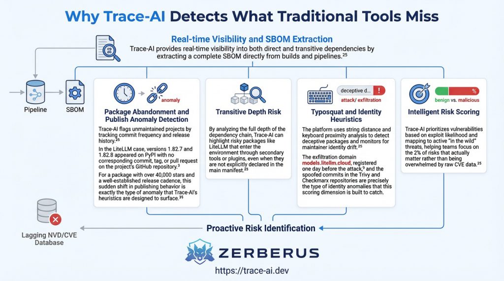 The LiteLLM supply chain attack of 2026 was not a failure of individual developers but a failure of the current trust model of the open-source ecosystem. When a single poisoned package can reach the production environments of NASA, Netflix, and NVIDIA in hours, the “vibe coding” approach to dependency management must end.3The TeamPCP campaign has shown that attackers are moving upstream, targeting the tools that security professionals and AI researchers rely on most. The concentrated value of AI API keys and cloud credentials makes the AI orchestration layer a prime target for high-impact harvesting operations.2 As organisations continue to deploy AI at scale, the only way to maintain a secure posture is to achieve deep, real-time visibility into the entire supply chain. Tools like Trace-AI by Zerberus.ai provide the necessary foundation for this new era of assurance, ensuring that the software you depend on is a source of strength, not a vector for catastrophic compromise.25