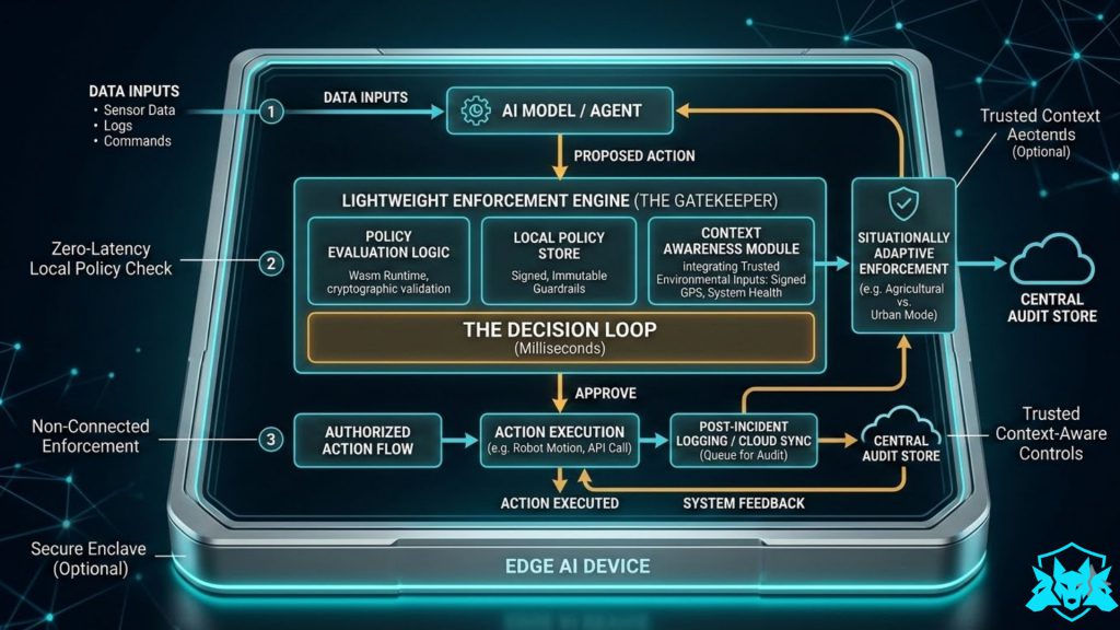 To achieve this, most edge governance architectures introduce a policy enforcement layer between the AI model and the system actuators.
